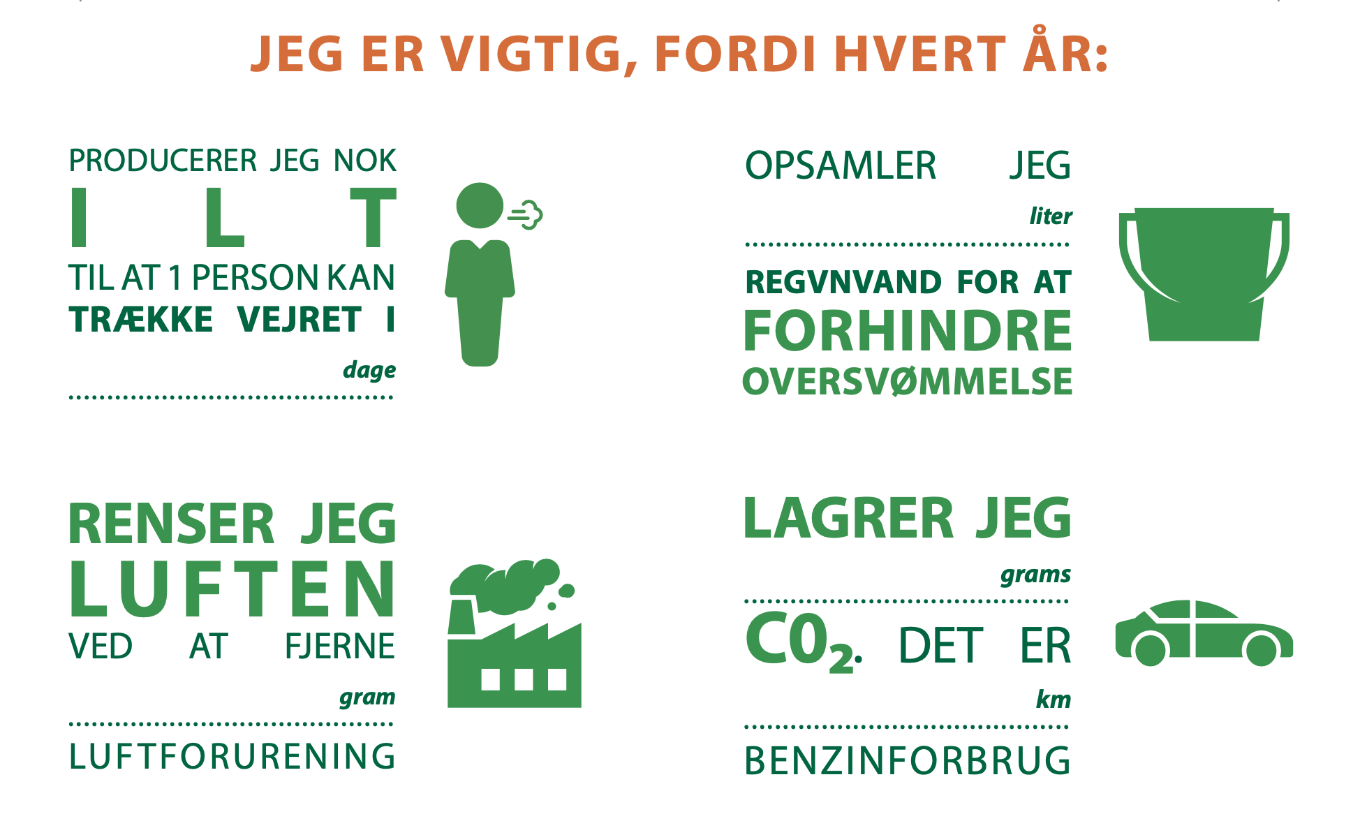 Træer spiller en afgørende rolle i reguleringen af bymiljøet og leverer tjenester, der regulerer solstråling, vindhastighed, omgivende lufttemperaturer, relativ luftfugtighed og genudstråling fra asfalterede områder. De giver skygge, sænker temperaturen under deres kroner og reducerer varme-ø-effekten, der almindeligvis observeres/ses i byer. Denne effekt, forårsaget af beton og asfalt der absorberer og genudsender varme, kan hæve temperaturen betydeligt. Et enkelt fuldt udvokset træ kan transpirere op til 379 liter vand på en varm dag, hvilket også afkøler luften når det fordamper. Derfor kan kvarterer med mange fuldt udvoksne træer være flere grader køligere, hvilket reducerer behovet for aircondition og sænker energiomkostningerne.